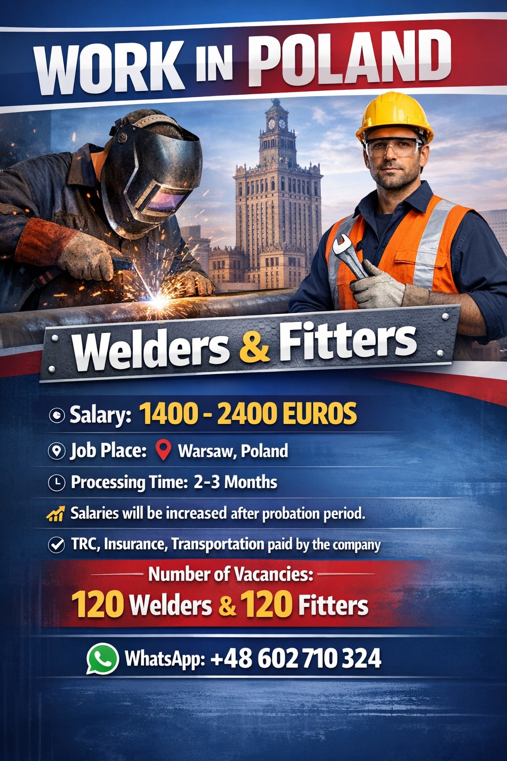 Poland offers excellent career prospects for skilled welders across industries such as shipbuilding, construction, and manufacturing. With modern facilities, attractive salaries, and a high demand for qualified professionals, welders can build a stable and rewarding career. Join Poland’s growing industrial workforce and take the next step toward a secure and successful future in Europe.