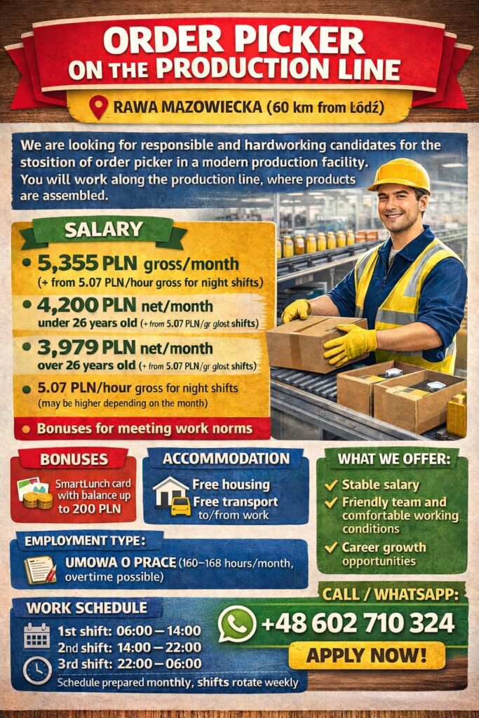 Order pickers and production line workers are essential to efficient warehouse and manufacturing operations in Poland. We supply trained, reliable staff experienced in picking, packing, sorting, and assembly line work. Our candidates are ready to meet European standards, ensuring speed, accuracy, and consistent productivity.
